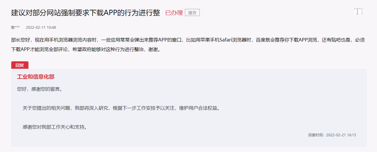 2 月 11 日,有網(wǎng)友在人民網(wǎng)“領(lǐng)導(dǎo)留言板”以“建議對(duì)部分網(wǎng)站強(qiáng)制要求下載 App 的行為進(jìn)行整治”為題向工業(yè)和信息化部部長(zhǎng)、黨組書記肖亞慶留言稱,“現(xiàn)在用手機(jī)瀏覽器瀏覽內(nèi)容時(shí),一些應(yīng)用常常會(huì)彈出來推薦 App 的窗口,比如用蘋果手機(jī) Safari 瀏覽器時(shí),百度就會(huì)推薦你下載 App 瀏覽,還有貼吧也是,必須下載 App 才能瀏覽全部評(píng)論,希望政府能夠?qū)@種行為進(jìn)行整治。”