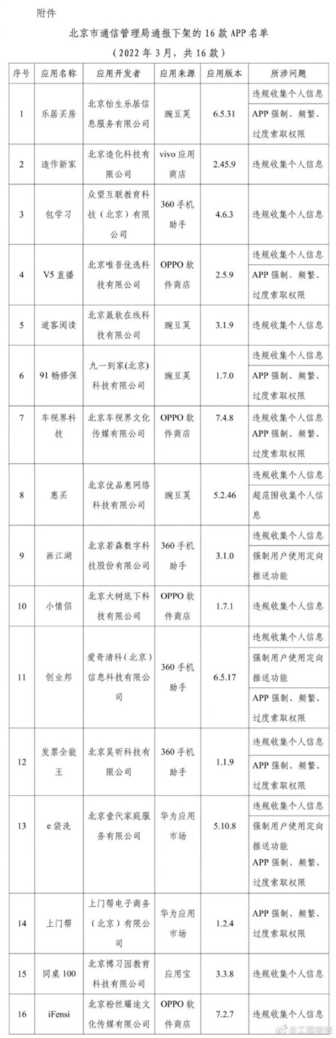 2 月 25 日,北京管局公開通報了 65 款存在侵害用戶權(quán)益問題的 App,截至通報規(guī)定時限,經(jīng)核查復(fù)檢,尚有 16 款 App 未按照要求完成整改。相關(guān)應(yīng)用商店應(yīng)立即組織對名單中的 App 進(jìn)行下架處理,并舉一反三,認(rèn)真系統(tǒng)排查反復(fù)出現(xiàn)問題的 App 開發(fā)運營者,嚴(yán)格落實分發(fā)平臺主體責(zé)任,把好上架審核關(guān)。