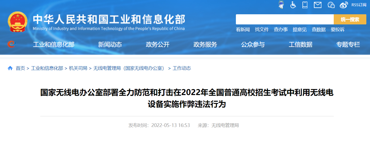 工信部今日宣布部署全力防范和打擊在 2022 年全國高考中利用無線電設備實施作弊違法行為,部署各省(區、市)無線電管理機構全力做好 2022 年高考考試無線電保障工作。